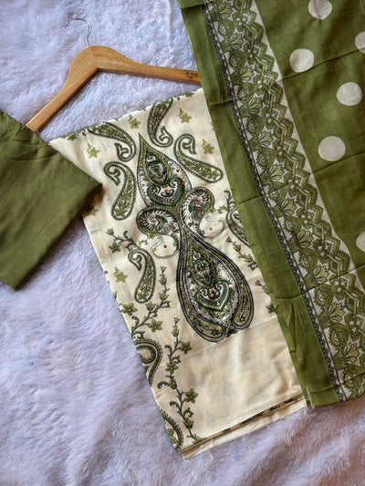 Elegant Cream Chikankari Unstitched Suit with Floral Embroidery & Printed Dupatta